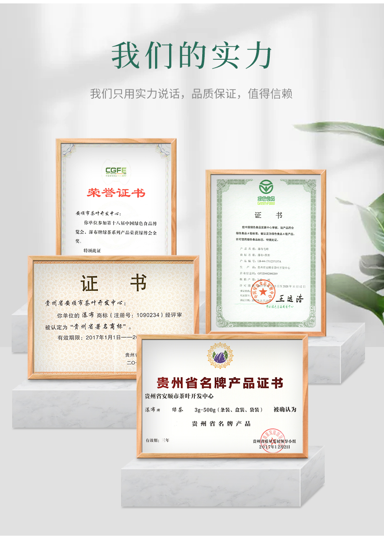 瀑布茶品牌是安顺市人民政府主打茶叶品牌,省级重点打造区域公共品牌,属贵州五大名茶,先后获得获“中国农产品区域公用品牌”、“贵州省著名商标”、“贵州省名牌产品”等荣誉称号。近年来,在各级部门大力推动下,瀑布茶品牌不断发展壮大。截止目前,现有瀑布茶品牌加盟企业23家,辐射茶园面积200000余亩,其中绿色食品认证茶园基地面积7000余亩,有机食品认证基地面积2500亩。拥有“瀑布毛峰”、“瀑布翠芽”“瀑布红茶”、“瀑布翠龙”等产品,多次获得“中绿杯”、“中茶杯”、“华茗杯”大奖;分别荣获14届中国国际农产品交易会金奖18届中国绿色食品博览会金奖、“黄山杯”首届全国传统名茶产品质量特别金奖、安顺十大旅游商品等殊荣及称号。